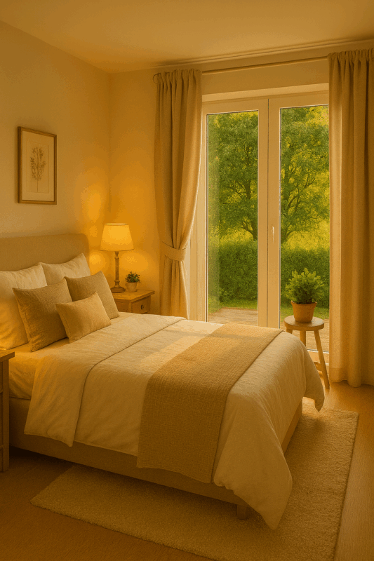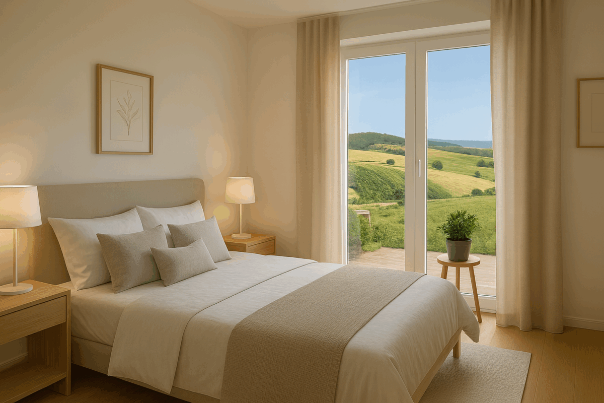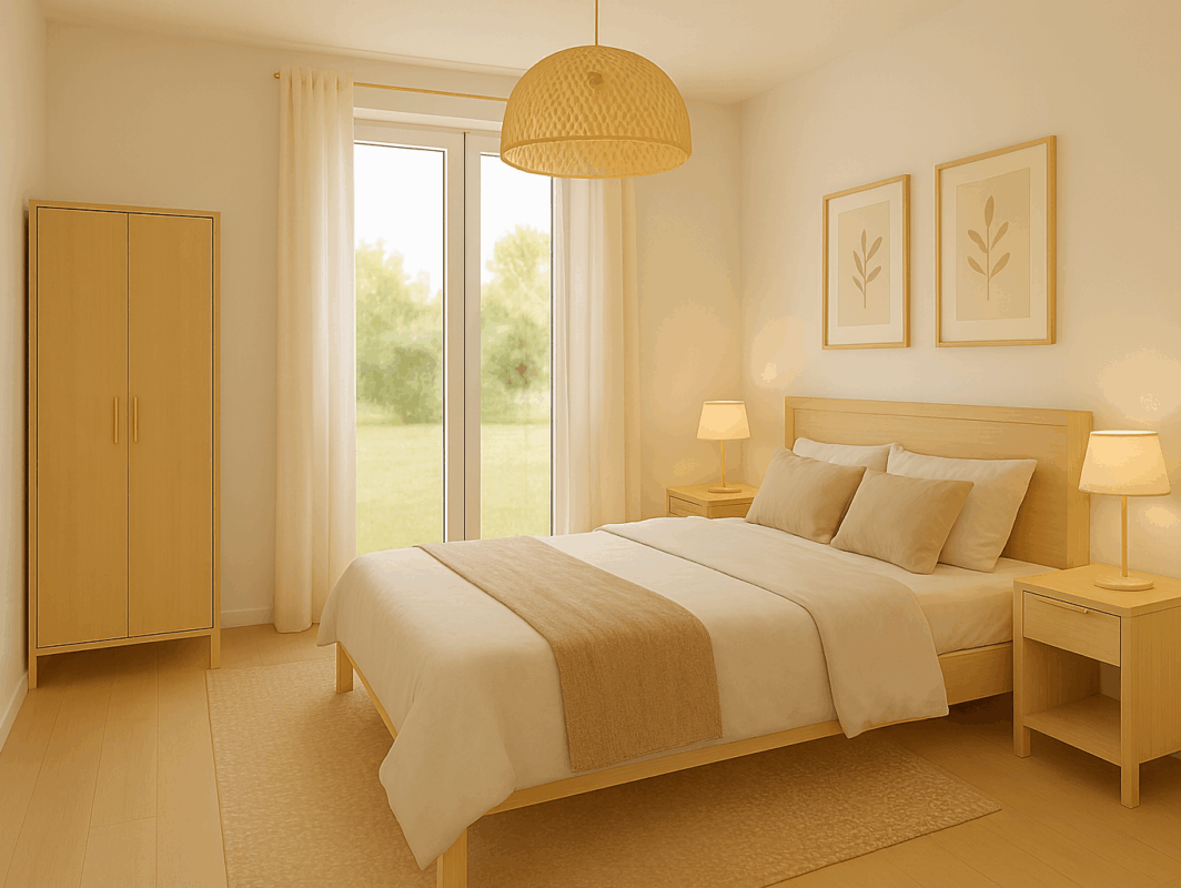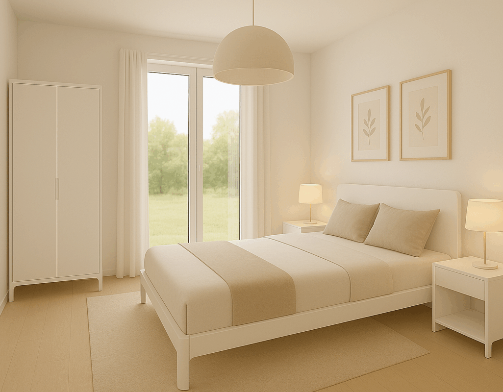Das Schlafzimmer ist klar geschnitten und gemütlich – perfekt für erholsame Nächte und persönliche Ruhe.