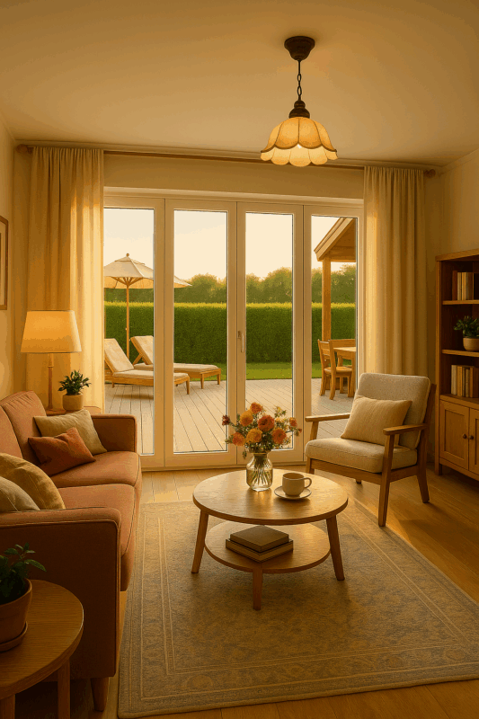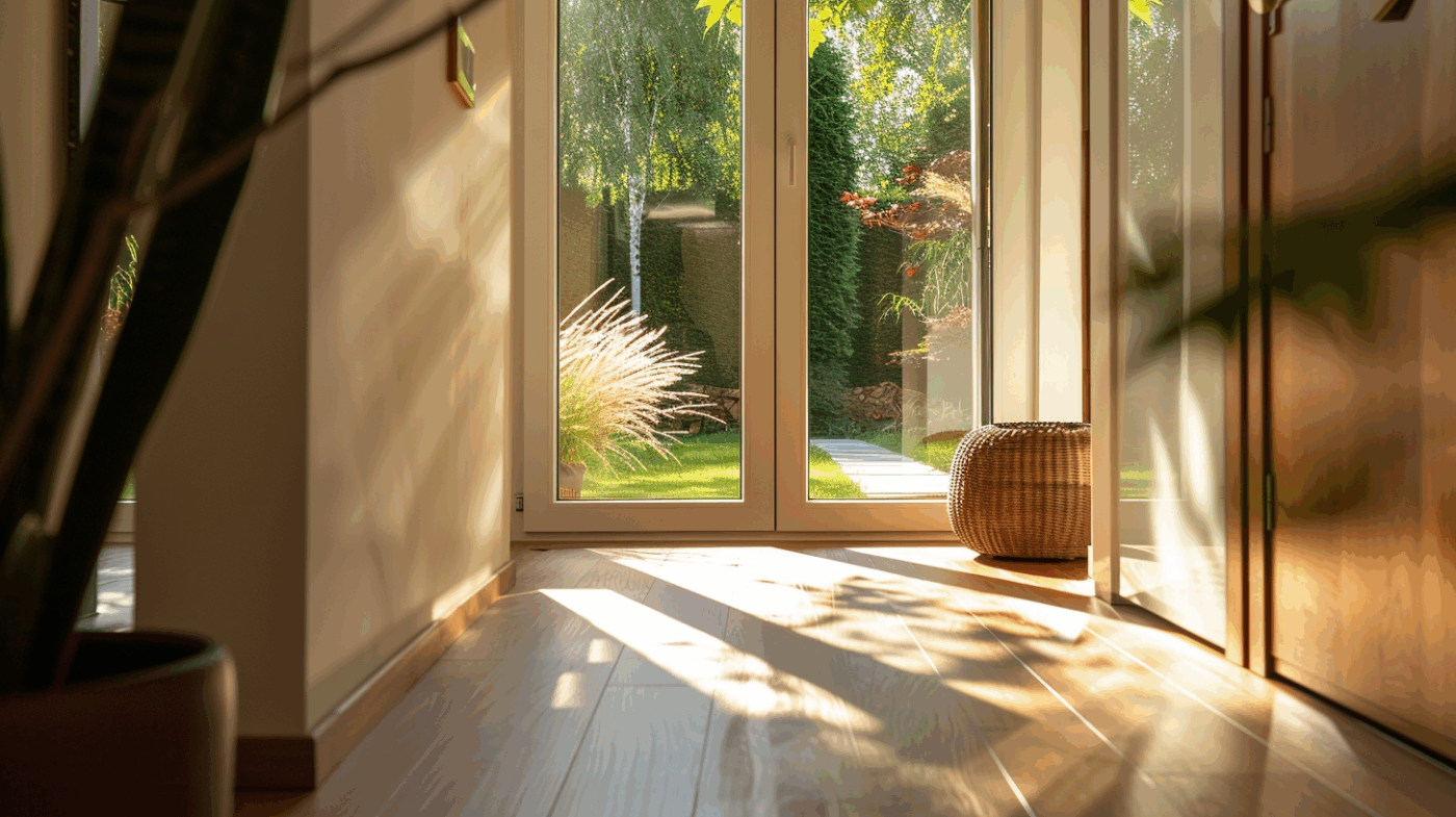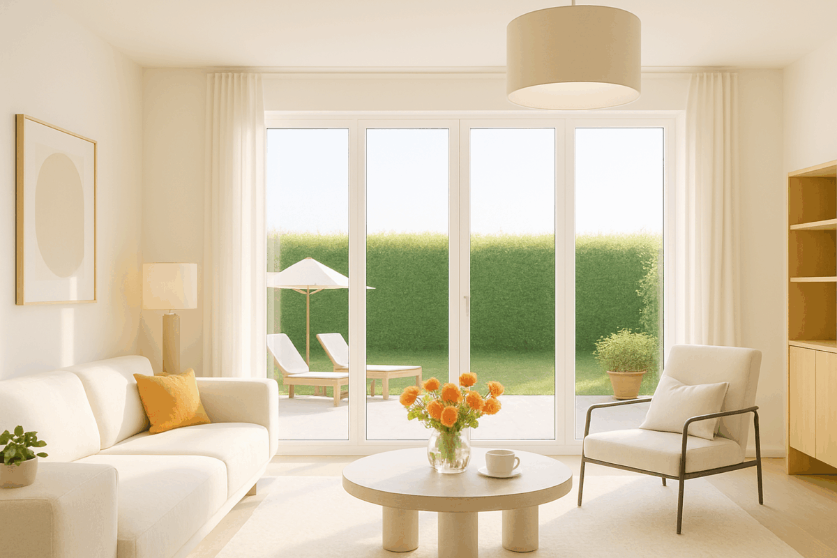 Beim Betreten öffnet sich ein großzügiger Wohnraum mit viel Licht dank der bodentiefen Fenster. Er bildet das Zentrum Ihres Hauses – ein Ort voller Wärme und Helligkeit, der Terrasse und Garten nahtlos einbindet.