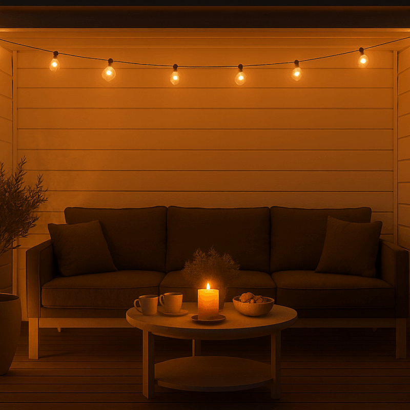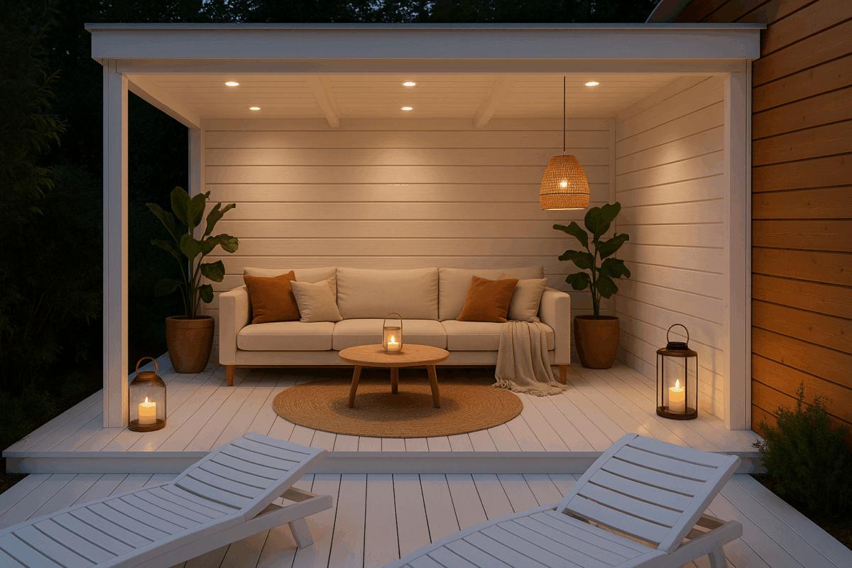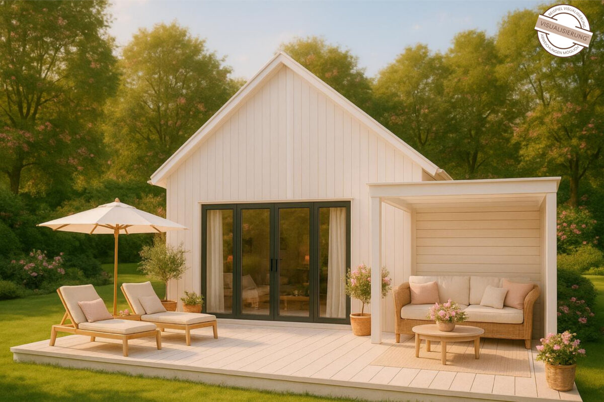 Direkt an den Wohnbereich schließt sich der überdachte Freisitz an. Hier entsteht ein ganz eigener Lebensraum: geschützt vor Sonne oder Regen, aber mit der frischen Brise und dem Duft der Natur immer in Reichweite. Ob als Outdoor-Esszimmer, gemütliche Leseecke oder Platz für lange Gespräche – der Freisitz wird schnell zum Herzstück des Sommers.