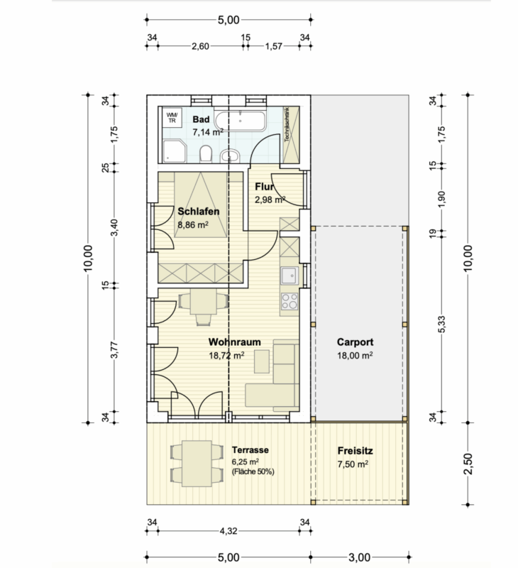 Direkt am Haus befindet sich ein überdachter Freisitz, der als zweites Wohnzimmer im Freien dient. Ob sonnige Frühstücksstunden, laue Sommerabende oder ruhige Momente in frischer Luft – hier entsteht Ihr persönlicher Wohlfühlplatz, der durch die Überdachung wettergeschützt bleibt.