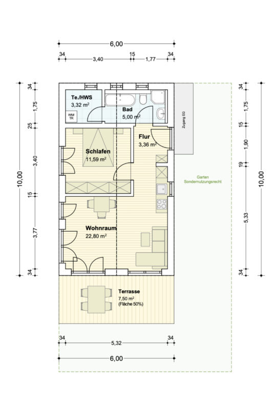 Jede Einheit umfasst rund 50 m² Wohnfläche, ist clever geschnitten, hell gestaltet und verfügt über einen eigenen Eingang mit Haustüre, ganz ohne Gemeinschaftstreppenhaus.